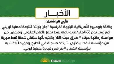 #أوج #واشنطن وكالة بلومبيرغ الأمريكية: البارجة الفرنسية “جان بارت” التابعة لعملية ايريني اعترضت يوم 22 الماء/مايو ناقلة نفط تحمل العلم الغابوني ومنعتها من مواصلة رحلتها لميناء #طبرق حيث كان يشتبه بأنها ستنقل شحنة نفط مهربة من مؤسسة النفط ببنغازي لشركة مسجلة في الخليج، وفق ما أبلغت به مؤسسة النفط بـ #طرابلس قيادة عملية ايرني. #قناة_الجماهيرية_العظمى_قناة_كل_الجماهير