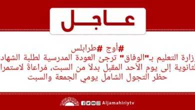 #أوج #طرابلس وزارة التعليم بـ”الوفاق” ترجئ العودة المدرسية لطلبة الشهادة الثانوية إلى يوم الأحد المقبل بدلاَ من السبت، مُراعاةَ لاستمرار حظر…
