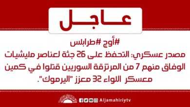 عاجل | #أوج #طرابلس مصدر عسكري: التحفظ على 26 جثة لعناصر مليشيات الوفاق منهم 7 من المرتزقة السوريين قتلوا في كمين معسكر اللواء 32 معزز “اليرموك”. #قناة_الجماهيرية_العظمى_قناة_كل_الجماهير