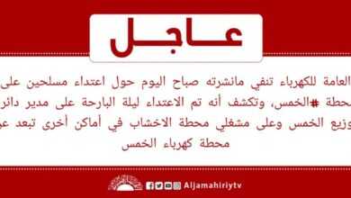 عاجل // العامة للكهرباء تنفي مانشرته صباح اليوم حول اعتداء مسلحين على محطة #الخمس، وتكشف أنه تم الاعتداء ليلة البارحة على مدير دائرة توزيع الخمس وعلى مشغلي محطة الاخشاب في أماكن أخرى تبعد عن محطة كهرباء الخمس #قناة_الجماهيرية_العظمى_قناة_كل_الجماهير