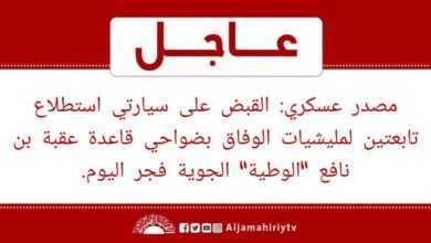 عاجل // مصدر عسكري: القبض على سيارتي استطلاع تابعتين لمليشيات الوفاق بضواحي قاعدة عقبة بن نافع “الوطية” الجوية فجر اليوم #قناة_الجماهيرية_العظمى_قناة_كل_الجماهير