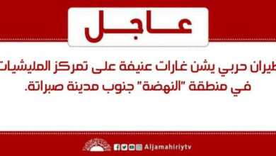 طيران حربي يشن غارات عنيفة على تمركز المليشيات في منطقة “النهضة” جنوب مدينة #صبراتة.