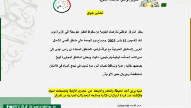 عاجل// تنبيه جوي: أمطار متوسطة إلى غزيرة غدٍ الخميس على مناطق أقصى الشمال الغربي. -يرجى أخذ الحيطة والحذر والابتعاد…