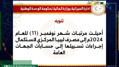 عاجل// مالية الدبيبة تعلن إحالة مرتبات شهر نوفمبر إلى مصرف ليبيا المركزي لاستكمال إجراءات تسييلها إلى حسابات الجهات العامة.