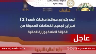 عاجل// مالية الدبيبة: البدء بتوزيع حوافظ مرتبات شهر “2” فبراير لجميع القطاعات الممولة من الخزانة العامة.