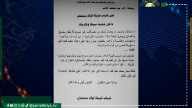 حذر شباب قبيلة أولاد سليمان داخل مدينة سبها وخارجها من أي تصرفات غير مسؤولة تطال مشائخ وأعيان ورموز القبيلة.…