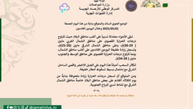 توقع المركز الوطني للأرصاد الجوية اليوم الجمعة ان تبقى الأجواء معتدلة نسبياً على أغلب مناطق البلاد. ومن المتوقع ان تسجل…