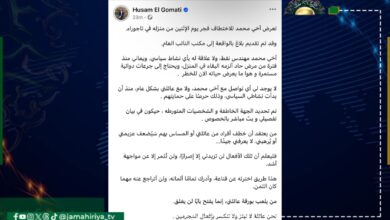 كشف الناشط الحقوقي، حسام القماطي، اختطاف شقيقه “محمد”، فجر يوم الإثنين الماضي، من منزله في تاجوراء. وقال القواطي، في…