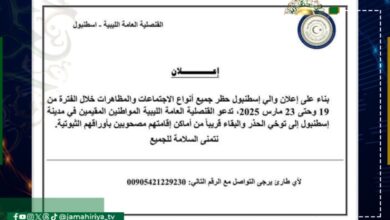القنصلية الليبية تطالب الجالية المتواجدة في إسطنبول بحظر جميع أنواع الاجتماعات والمظاهرات