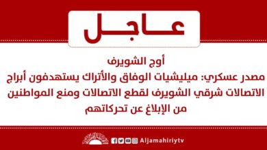 أوج الشويرف مصدر عسكري: ميليشيات الوفاق والأتراك يستهدفون أبراج الاتصالات شرقي الشويرف لقطع الاتصالات ومنع المواطنين من الإبلاغ عن تحركاتهم