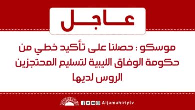 عاجل // موسكو : حصلنا على تأكيد خطي من حكومة الوفاق الليبية لتسليم المحتجزين الروس لديها