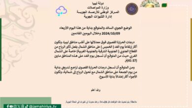 الأرصاد الجوية: درجات الحرارة فوق معدلاتها على أغلب مناطق ليبيا وأكثر ارتفاعاً يوم الغد توقع مركز الأرصاد الجوية، أن…