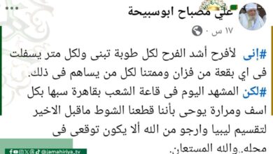 ابو سبيحة: المشهد اليوم فى قاعة الشعب بقاهرة سبها يوحى بأننا قطعنا الشوط ما قبل الأخير لتقسيم ليبيا اكد على…