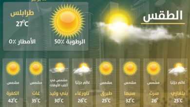 إعتدال نسبي في درجات الحرارة على أغلب مناطق شمال ليبيا مع رطوبة عالية على المناطق الساحلية واحتمال ظهور ضباب خفيف…