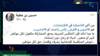 قال حسين بن عطية، عميد بلدية تاجوراء السابق، إن أكبر الخطايا التي تهدد العملية الانتخابية هي التزوير وفرض الأمر…