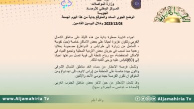 توقع مركز الأرصاد الجوية سقوط أمطار غزيرة على أغلب مناطق شمال غرب ليبيا ،وتكون شديدة الغزارة احيانا على بعض المناطق…