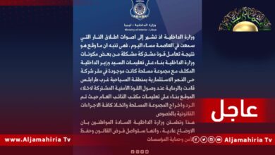 عاجل// داخلية الدبيبة: أصوات إطلاق النار التي سمعت في العاصمة نتيجة تعامل قوة مشتركة مع مجموعة مسلحة كانت موجودة بمقر…