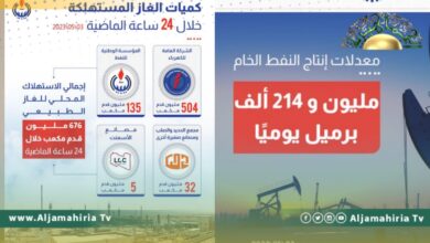 مؤسسة النفط: إنتاج الخام بلغ مليون و 214 ألف برميل يوميا أعلنت مؤسسة النفط وصول إنتاج الخام إلى مليون و…