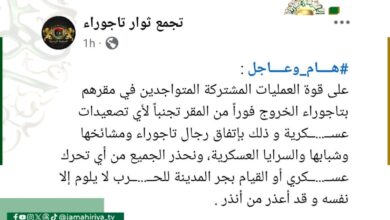 تجمع ثوار تاجوراء: نحذر المشتركة مصراتة من أي تحرك عسكري أو القيام بجر المدينة للحرب