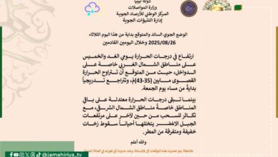 أعلن المركز الوطني للأرصاد الجوية، حالة الطقس المتوقعة على ليبيا خلال الأيام الثلاثة القادمة ابتداء من اليوم الثلاثاء 26 أغسطس…
