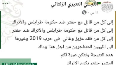 العتيري ينتقد تكريم حفتر لـ قالن: “رسالة مؤلمة لمن فقدوا أحباءهم في حرب 2019”