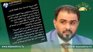 كشف الإعلامي بقناة 218 سابقًا خليل الحاسي، أن رئيس الوزراء بالحكومة المعينة من مجلس النواب أسامة حمّاد اشترى قطعة…