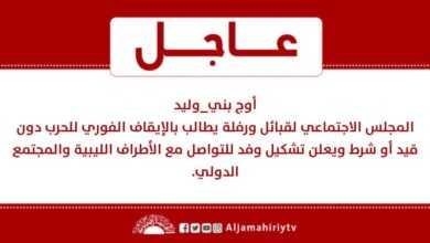 عاجل // أوج بني_وليد/ المجلس الاجتماعي لقبائل ورفلة يطالب بالإيقاف الفوري للحرب دون قيد أو شرط ويعلن تشكيل وفد للتواصل مع الأطراف الليبية والمجتمع الدولي.