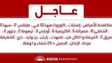 استلم المركز الوطني لمكافحة الامراض عدد (1179) عينة موزعة على النحو التالي: – المختبر المرجعي لصحة المجتمع بطرابلس عدد (707)…