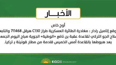 أوج خاص: موقع إتاميل رادار : مغادرة الطائرة العسكرية طراز C130 هرقل 711468 والتابعة لسلاح الجو التركي لقاعدة عقبة بن نافع “الوطية” الجوية صباح اليوم الجمعة، بعد هبوطها بالقاعدة أمس الخميس قادمة من مطار قونينة بـ تركيا.