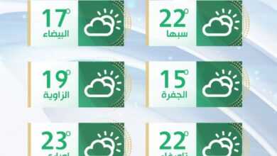 يسود طقس معتدل على أغلب مناطق البلاد مع رياح نشطة نسبيا على بعض مناطق غربي البلاد دون سقوط أمطار ودرجات…