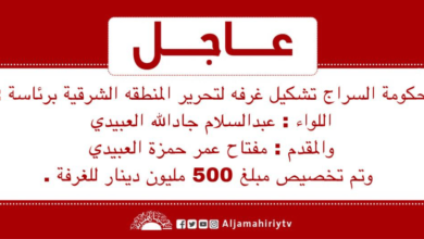 عاجل // حكومة السراج تشكيل غرفه لتحرير المنطقه الشرقية برئاسة : اللواء : عبدالسلام جادالله العبيدي . والمقدم : مفتاح عمر حمزة العبيدي . وتم تخصيص مبلغ 500 مليون دينار للغرفة #قناة_الجماهيرية_العظمى_قناة_كل_جماهير