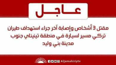 مقتل 3 أشخاص وإصابة آخر جراء استهداف طيران تركي مسير لسيارة في منطقة تينيناي جنوب مدينة بني وليد