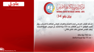 عاجل | بيان المركز الوطني لمكافحة الأمراض ( 34 ) بشأن تسجيل حالة جديدة لفيروس كورونا المستجد. #قناة_الجماهيرية_العظمي_قناة_كل_الجماهير