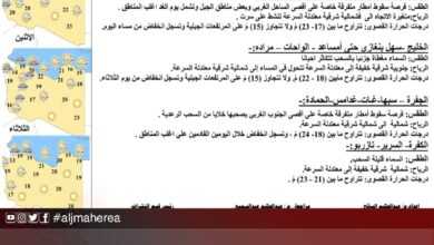 قال المركز الوطني للأرصاد الجوية اليوم الإثنين، أنه من المتوقع سقوط أمطار متفرقة من مساء اليوم على أغلب مناطق غرب…