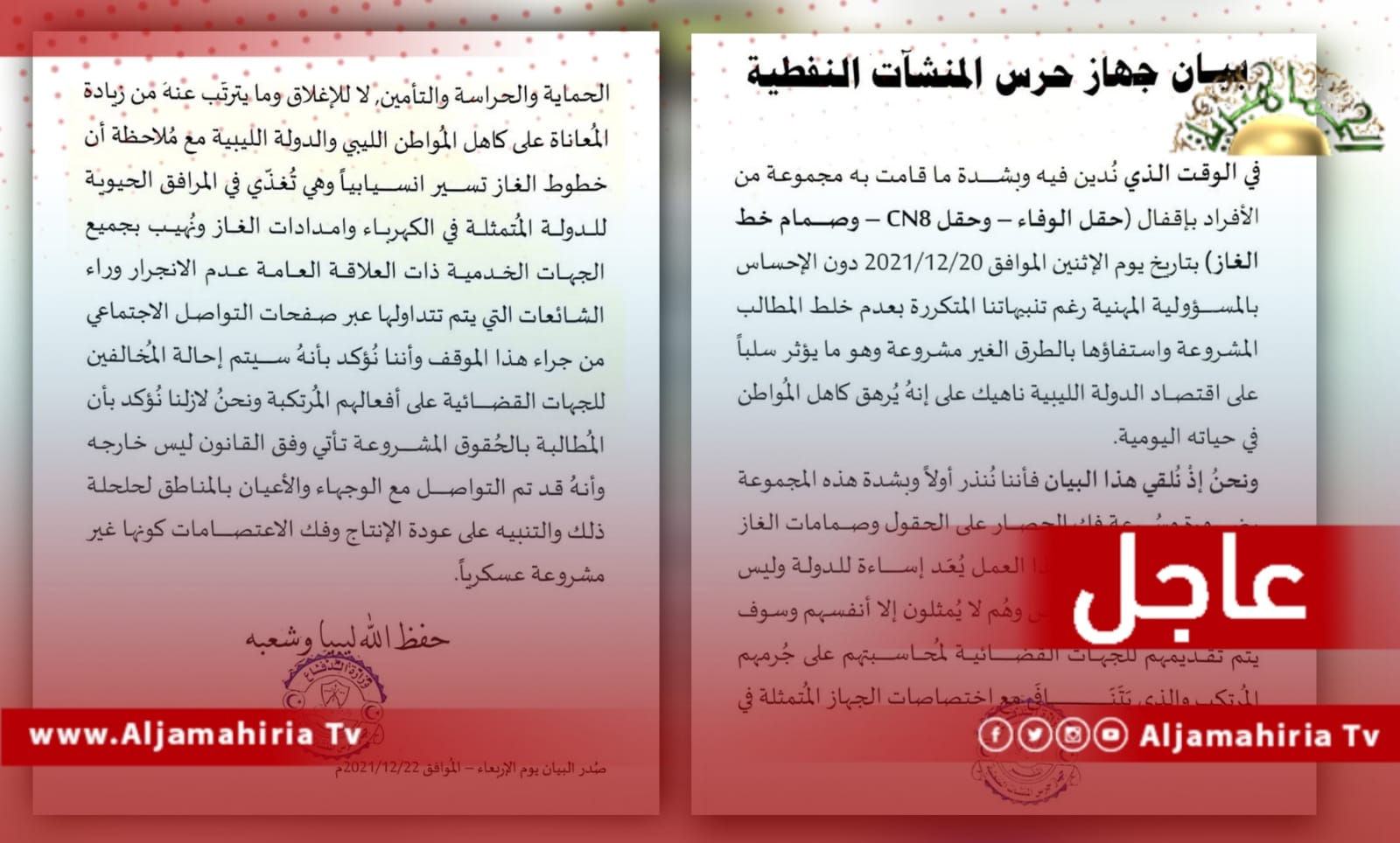 عاجل| حرس المنشآت النفطية يطالب العناصر التي أغلقت الحقول وصمامات الغاز بضرورة فك الحصار عنها دون أي شروط ويتوعد بتقديمهم للجهات القضائية لمحاسبتهم
