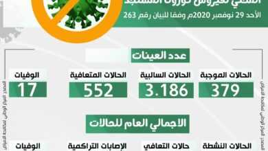 التحديث اليومي للوضع الوبائي المحلي لفيروس كورونا المستجد ليوم الأحد 29 نوفمبر 2020 م وفقا للبيان رقم (263)